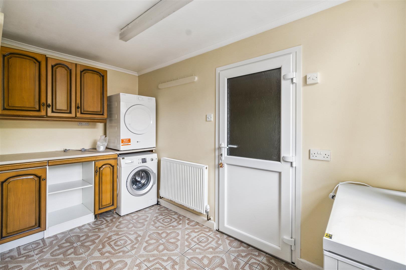 The generous kitchen is fitted with an extensive range of cabinetry and worktops, with a dedicated utility room and an additional storeroom offering excellent practicality. From here, access is granted to a paved terrace perfect for al fresco dining and summer gatherings.