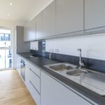 The dual aspect open plan living room has an expanse of glass, creating a seamless transition to the lovely water view and a fitted kitchen including integrated oven, fridge/freezer and dishwasher. A spacious storage cupboard off the hall houses the washer/dryer.
